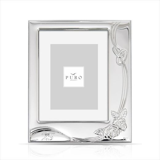 Anniversary Photo Frame 15x20cm PU8214/15 25th Anniversary Wedding Rings with Roses. 25th wedding anniversary photo frame. Off-center rose design with silver trim. Wedding anniversary keepsakes. 15x20cm. Ref. PU8214/15