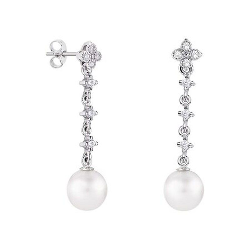 Argyor MRM 8mm Sphere Silver Earrings (AG)79B0103TD1 Pearl Topaz. Earrings made of 925 sterling silver 925/000. Weight 1.83gr. Flower-shaped heads with 4 white topazes, total 8 topazes of 1.25mm. Pressure closure. Central design of each earring with three white topazes of 2.00mm. Finished with two round 8mm white pearls. Certificate of authenticity and quality guarantee on manufacturing materials. Ref (AG)79B0103TD1