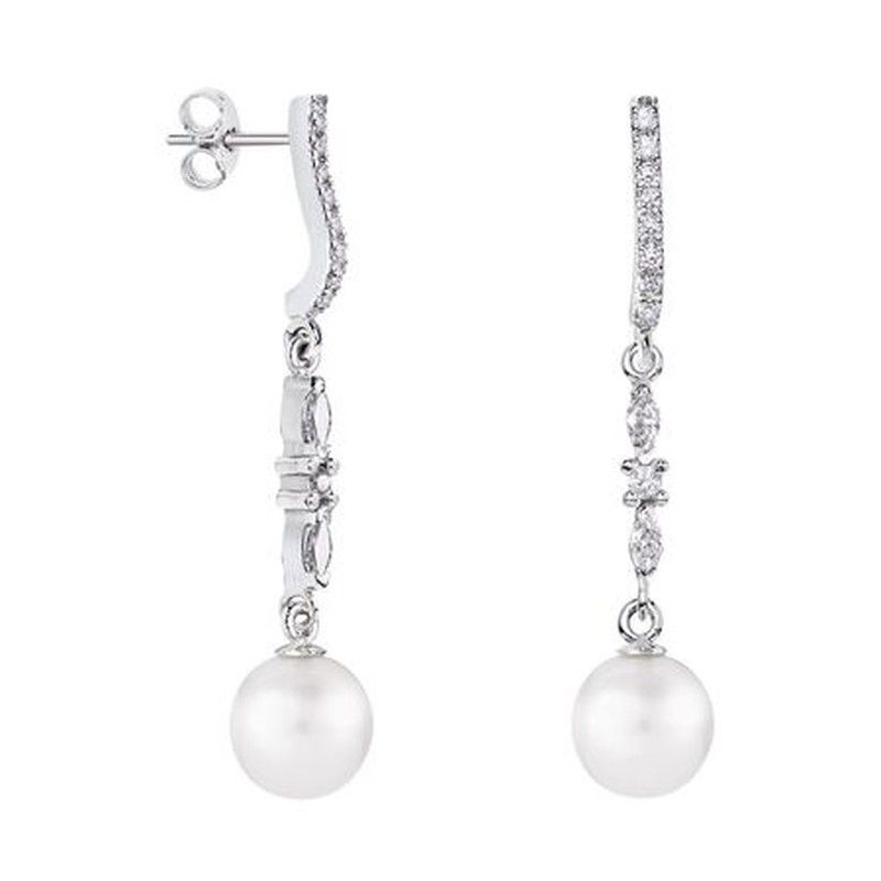 Argyor MRM 8mm Sphere Silver Earrings (AG)79B0505TD1 Pearl Topaz. Earrings made of 925 sterling silver 925/000. Weight 1.83gr. Bar-shaped heads with 10 white topazes, total 20 topazes of 1.10mm. Pressure closure. Central design of each earring with two marquise-cut white topazes of 3x1.5mm and a brilliant-cut white topaz of 2.00mm. Finished with two 8mm round white pearls. Certificate of authenticity and quality guarantee on manufacturing materials. Ref (AG)79B0505TD1