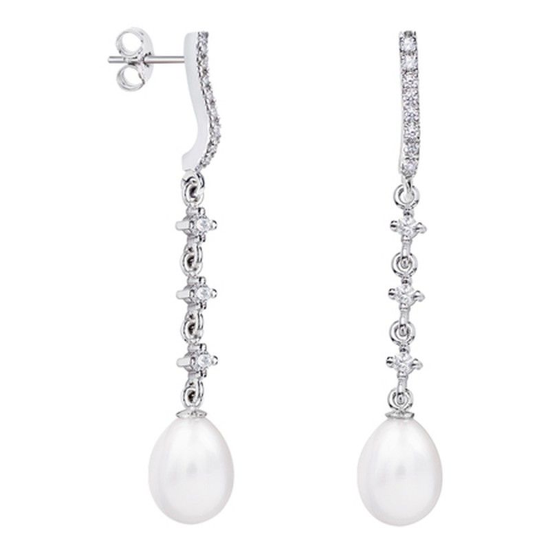 Argyor MRM 8mm Teardrop Silver Earrings (AG)79B0503TE1 Pearl Topaz. Earrings made of 925 sterling silver 925/000. Weight 2.01gr. Bar-shaped heads with 10 white topazes, total 20 topazes of 1.10mm. Pressure closure. Central design of each earring with three 2.00mm white topazes. Finished with two 8mm white teardrop-shaped pearls. Certificate of authenticity and quality guarantee on manufacturing materials. Ref (AG)79B0503TE1
