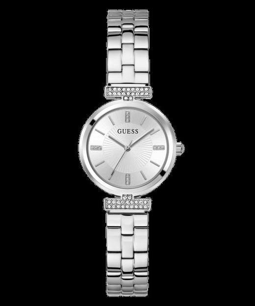 Guess Women's Watch GW0762L1 Steel with Zirconia. 28mm steel case. Steel bracelet with zirconia. Folding clasp. Silver dial with zirconia. Mineral crystal. Quartz movement. 30m water resistance. 3-year warranty. Ref. GW0762L1