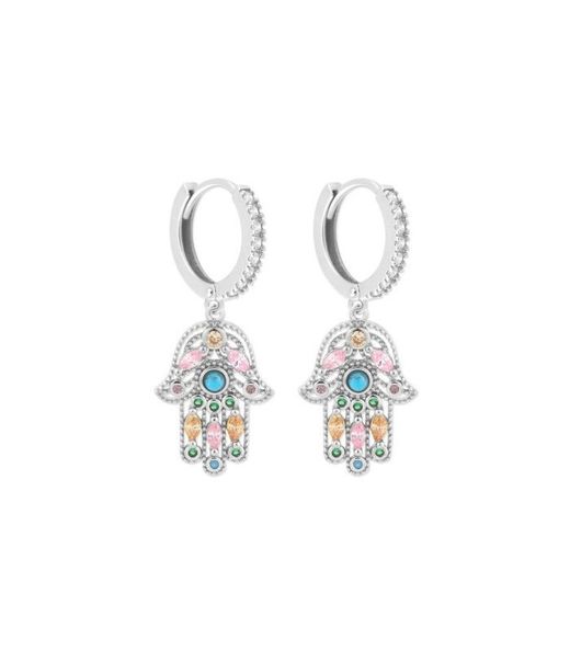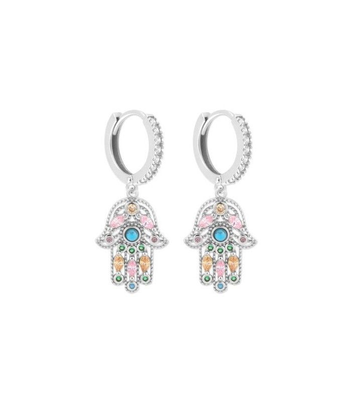 Liska Silver Earrings MED374A Fatima Hand Pendant Hoop Earrings. Earrings made of 925 sterling silver. Hoop design with a Fatima Hand pendant with multicolored stones and cubic zirconia. MEDITERRANEA Collection. Certificate of authenticity and quality guarantee on manufacturing materials. Ref. MED374A
