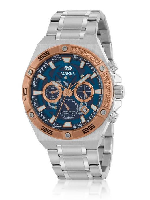 Marea Men's Watch B35374/3 Pink Bicolor Steel. 43mm Pink Bicolor Steel case. Pink steel bezel. Pink Bicolor Steel bracelet. Folding clasp. Blue dial. Multifunction, calendar, stopwatch. Mineral crystal. Quartz movement. Water resistant to 100m. 3-year warranty. Ref. B35374/3