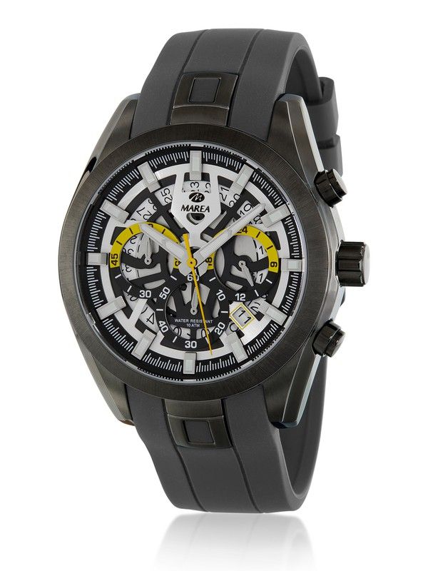 Marea Men's B54255/4 Sport Black Watch. 45mm black steel case. Black silicone strap. Buckle closure. Black dial. Multifunction, calendar, stopwatch. Mineral crystal. Quartz movement. 50m water resistance. 3-year warranty. Ref. B54255/4