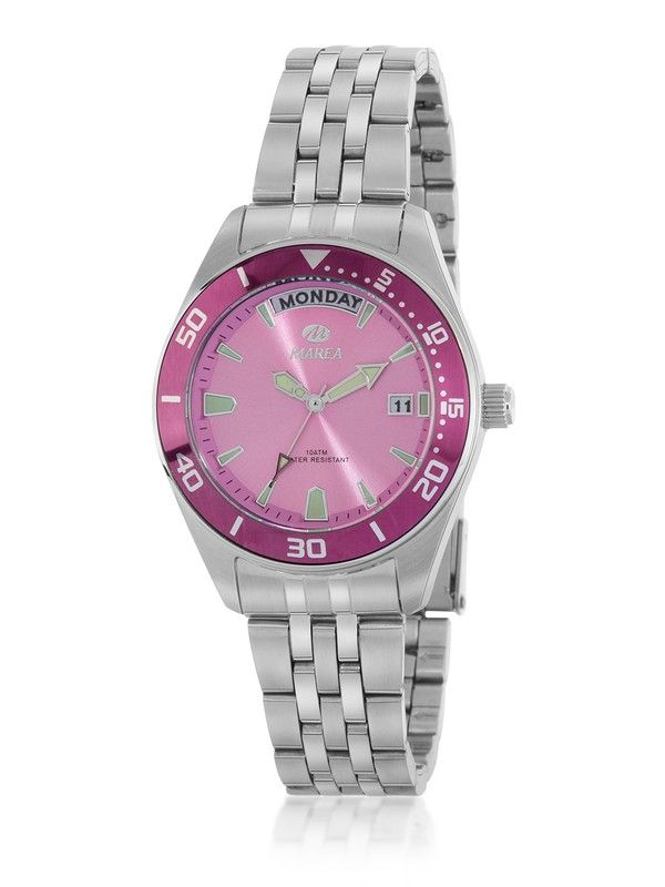 Marea Women's Watch B36203/1 Steel. 33mm steel case. Pink steel bezel. Steel bracelet. Folding clasp. Pink dial. Multifunction, calendar. Mineral crystal. Quartz movement. 100m water resistance. 3-year warranty. Ref. B36203/1