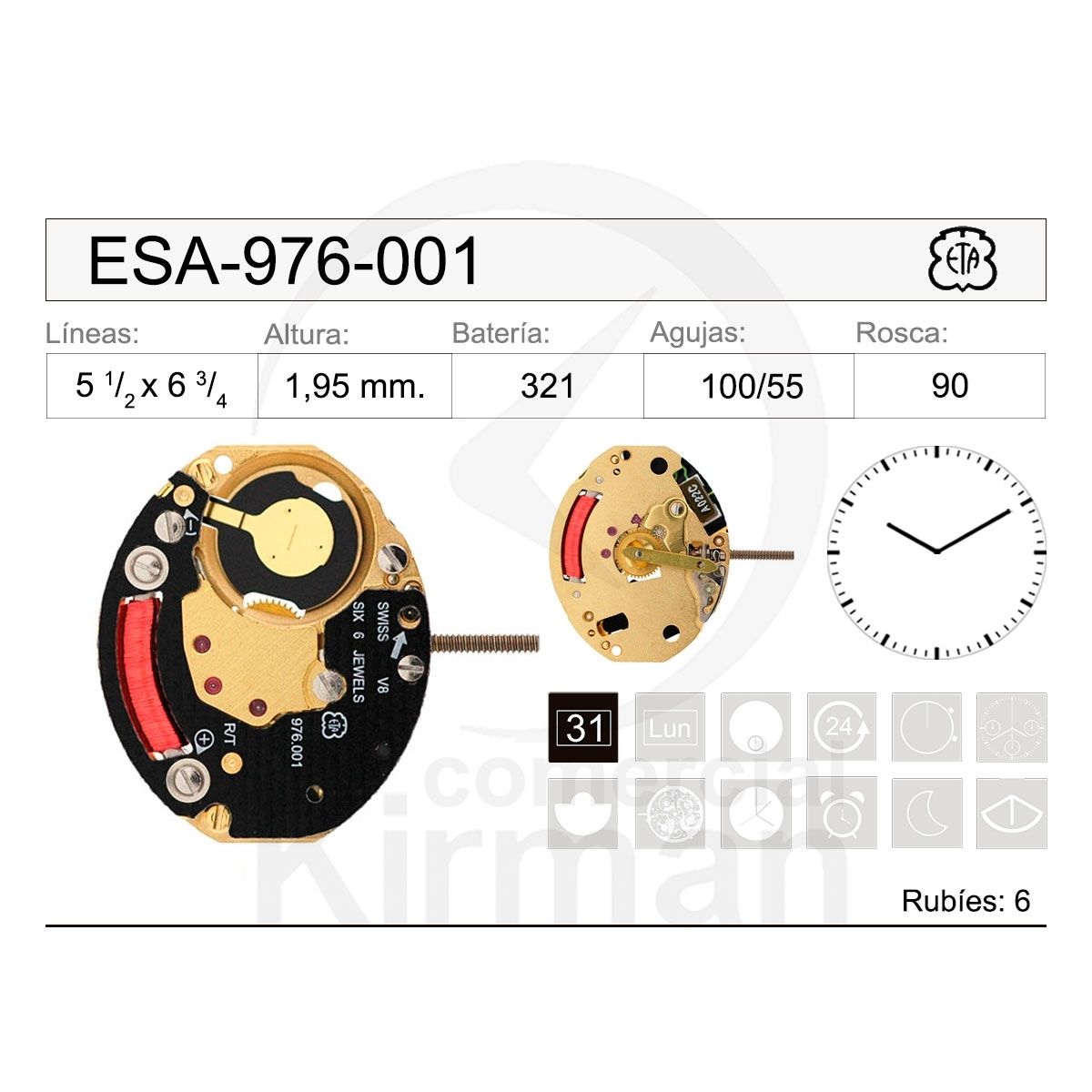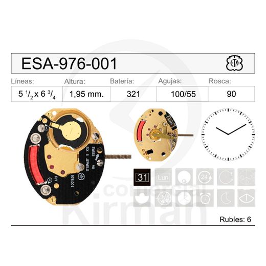 Movimiento Reloj Cuarzo ETA ESA-976-001. Movimiento de cuarzo Bateria 321 con 6 rubíes Pletina Dorada. Diseño de ESA-976-001 con dos agujas. Producto de excelente calidad, con garantía contrastada que asegura su fiabilidad y durabilidad. Ref ESA-976-001