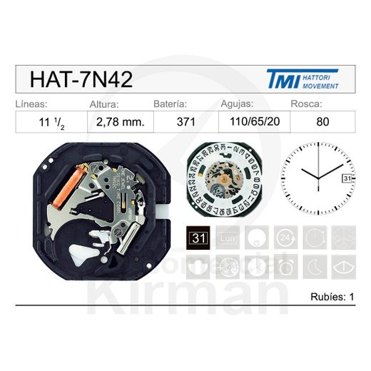 Movimiento Reloj Hattori Cuarzo HAT-7N42 con calendario a las 3H. Movimiento de reloj fabricado en cuarzo Bateria 371 con 1 rubí. Diseño de HAT-7N42 con segundero central, calendario a las 3H. Producto de excelente calidad, con garantía contrastada que asegura su fiabilidad y durabilidad. Ref HAT-7N42