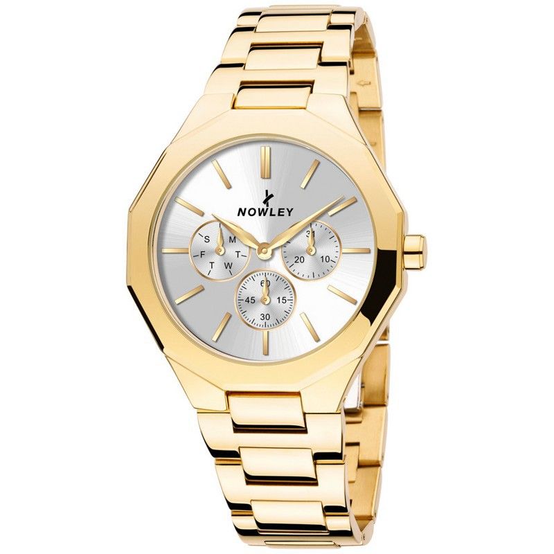 Nowley Men's Watch 8-0067-0-1 Gold. 42 × 42 × 8.4 mm gold-tone metal case. Gold-tone stainless steel bracelet. Concealed pin clasp. Analog. Quartz movement. Calendar. Mineral crystal. 30m water resistance. 3-year warranty. Ref. 8-0067-0-1