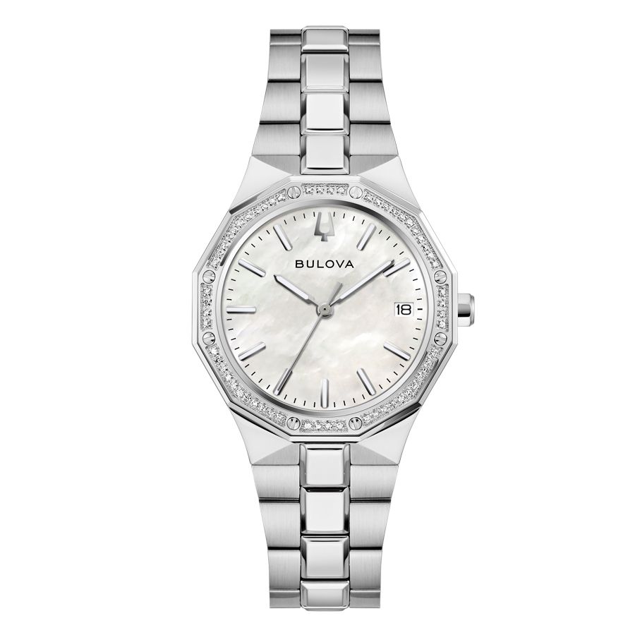 Reloj Bulova Mujer 96R255 Acero Plateado Analógico. Caja de acero 316L inoxidable plateado de 32mm de diámetro. Bisel plateado con 60 diamantes. Brazalete de acero 316L inoxidable plateado. Cierre oculto doble pulsador. Esfera madre perla. Cristal zafiro plano. Luminous en agujas. Movimiento quartz 2115. Multifunción calendario, 3 agujas. Resistente al agua 100 metros. Peso 98gr. 3 ańos de garantía. Ref 96R255