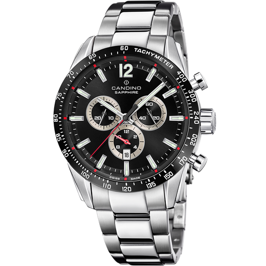 Reloj Candino Hombre C4757/D Acero Cronógrafo Analógico. Caja de acero plateado de 45mm de diámetro. Bisel negro. Brazalete de acero inoxidable. Incluye una correa de piel negra. Cierre desplegable. Esfera negra. Multifunción, calendario, cronógrafo. Cristal zafiro. Movimiento quartz. Swiss Made. Sumergible 100m. 3 años de garantía. Ref C4757/D