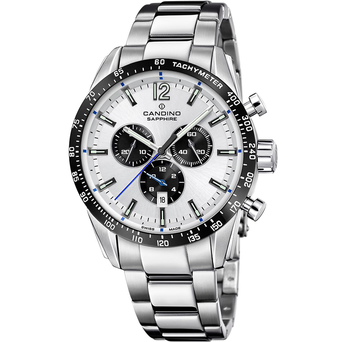 Reloj Candino Hombre C4757/E Acero Cronógrafo Analógico. Caja de acero plateado de 45mm de diámetro. Bisel negro. Brazalete de acero inoxidable. Incluye una correa de piel negra. Cierre desplegable. Esfera plateada. Multifunción, calendario, cronógrafo. Cristal zafiro. Movimiento quartz. Swiss Made. Sumergible 100m. 3 años de garantía. Ref C4757/E