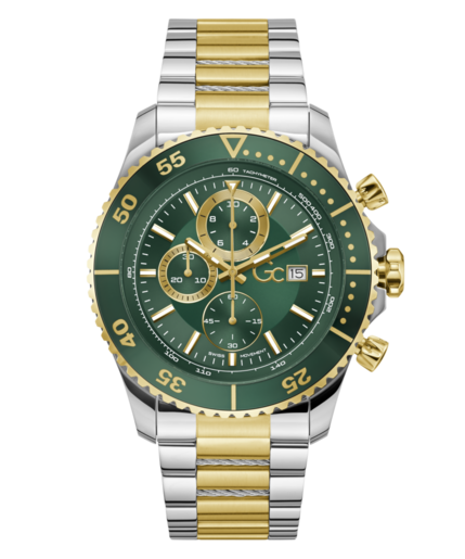 Reloj GC Hombre Z51006G9 Acero Plateado Bicolor Dorado Cronógrafo Analógico. Caja de acero plateado bicolor dorada de 44mm de diámetro. Bisel verde. Brazalete de acero plateado bicolor dorado. Cierre desplegable. Esfera verde. Multifunción, cronógrafo, calendario. Cristal mineral. Movimiento quartz. Sumergible 100m. 3 años de garantía. Ref Z51006G9