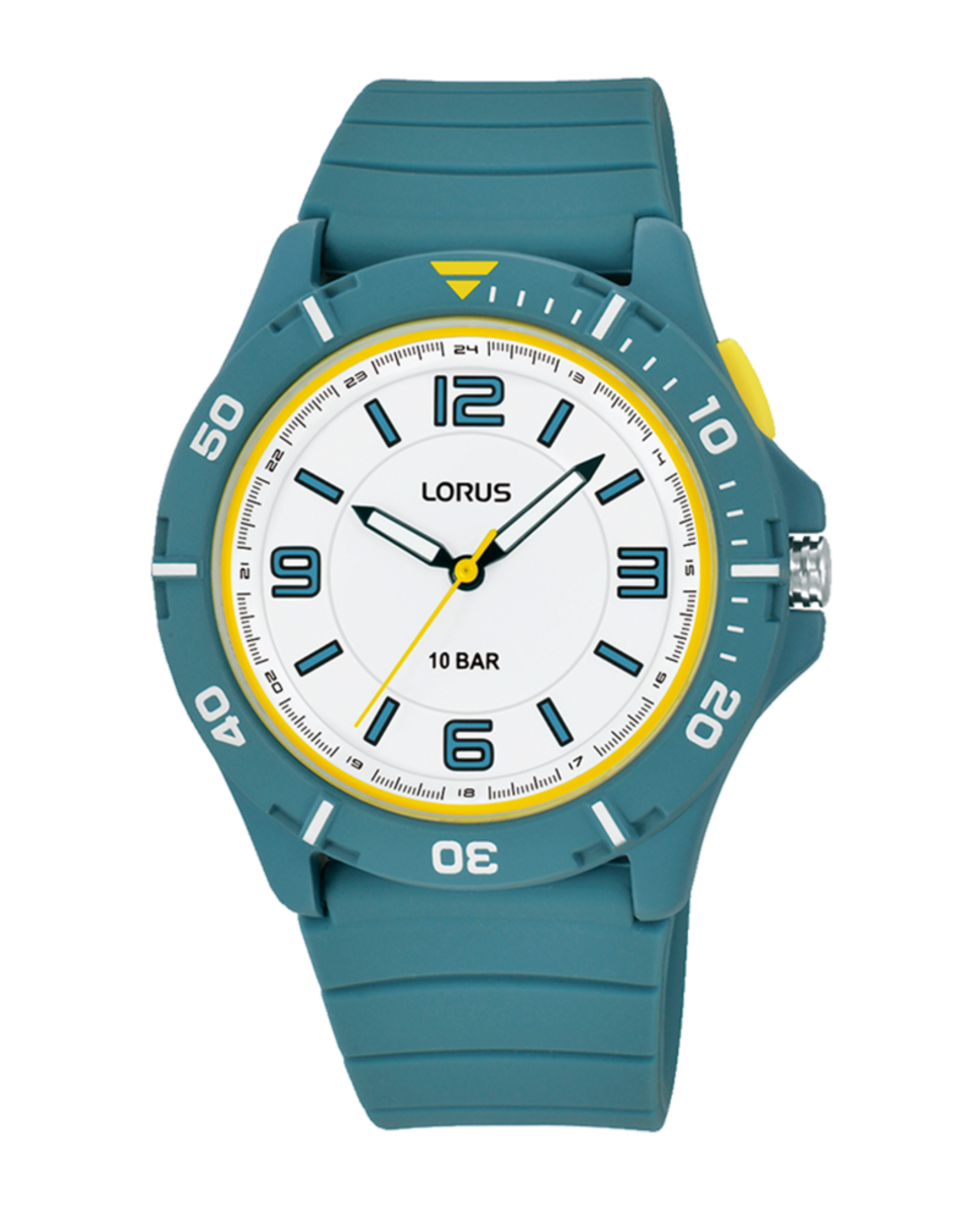Reloj Lorus Hombre R2313QX9 Sport Turquesa. Caja de plastico Turquesa de 40mm. Correa de silicon Turquesa. Cierre hebilla. Esfera blanca. Cristal mineral. Movimiento quartz. Sumergible 100m. 3 ańos de garantía. Ref R2313QX9