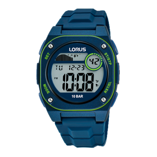 Reloj Lorus Hombre R2329QX9 Sport Azul Digital. Caja de plástico azul de 38mm de diámetro. Bisel azul. Correa de silicón azul. Cierre hebilla. Esfera azul. Multifunción, funciones digitales y calendario. Cristal acrílico. Movimiento quartz. Sumergible 100m. 3 años de garantía. Ref R2329QX9