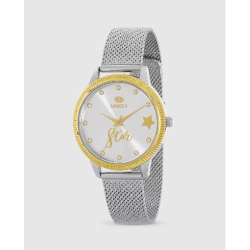 Reloj Marea Mujer B41385/15 Acero Analógico. Caja de acero de 36mm. Bisel dorado. Brazalete de malla de acero inoxidable. Cierre corredizo. Esfera blanca. Cristal mineral. Movimiento quartz. Sumergible 30m. Incluye pulsera de regalo. 3 años de garantía. Ref B41385/15