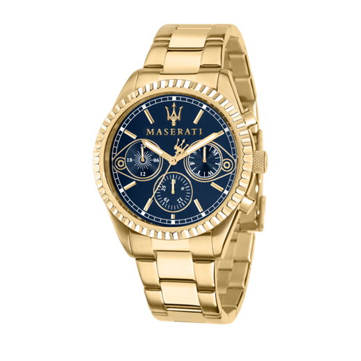 Reloj Maserati Hombre R8853100026 Competizione Acero Dorado Analógico. Caja de acero dorado de 43mm de diámetro. Bisel dorado. Brazalete de acero dorado. Cierre de mariposa. Esfera azul. Multifunción, subdial de fecha y día. Cristal mineral. Movimiento quartz. Sumergible 100m. 3 años de garantía. Ref R8853100026