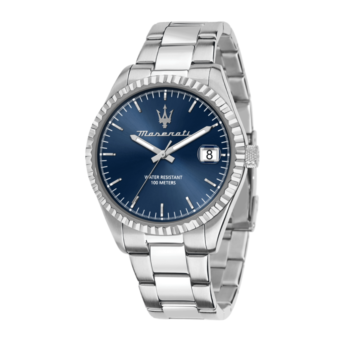 Reloj Maserati Hombre R8853100029 Competizione Azul Acero Plateado Analógico. Caja de acero de 43mm de diámetro. Bisel plateado. Brazalete de acero plateado. Cierre de broche. Esfera azul. Multifunción, calendario. Cristal mineral. Movimiento quartz. Sumergible 100m. 3 años de garantía. Ref R8853100029