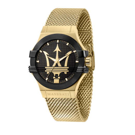 Reloj Maserati Hombre R8853108006 Potenza Acero Dorado Analógico. Caja de acero dorado de 42mm de diámetro. Bisel negro. Correa de malla de acero dorado. Cierre broche. Esfera negra. Cristal mineral. Movimiento quartz. Sumergible 100m. 3 años de garantía. Ref R8853108006