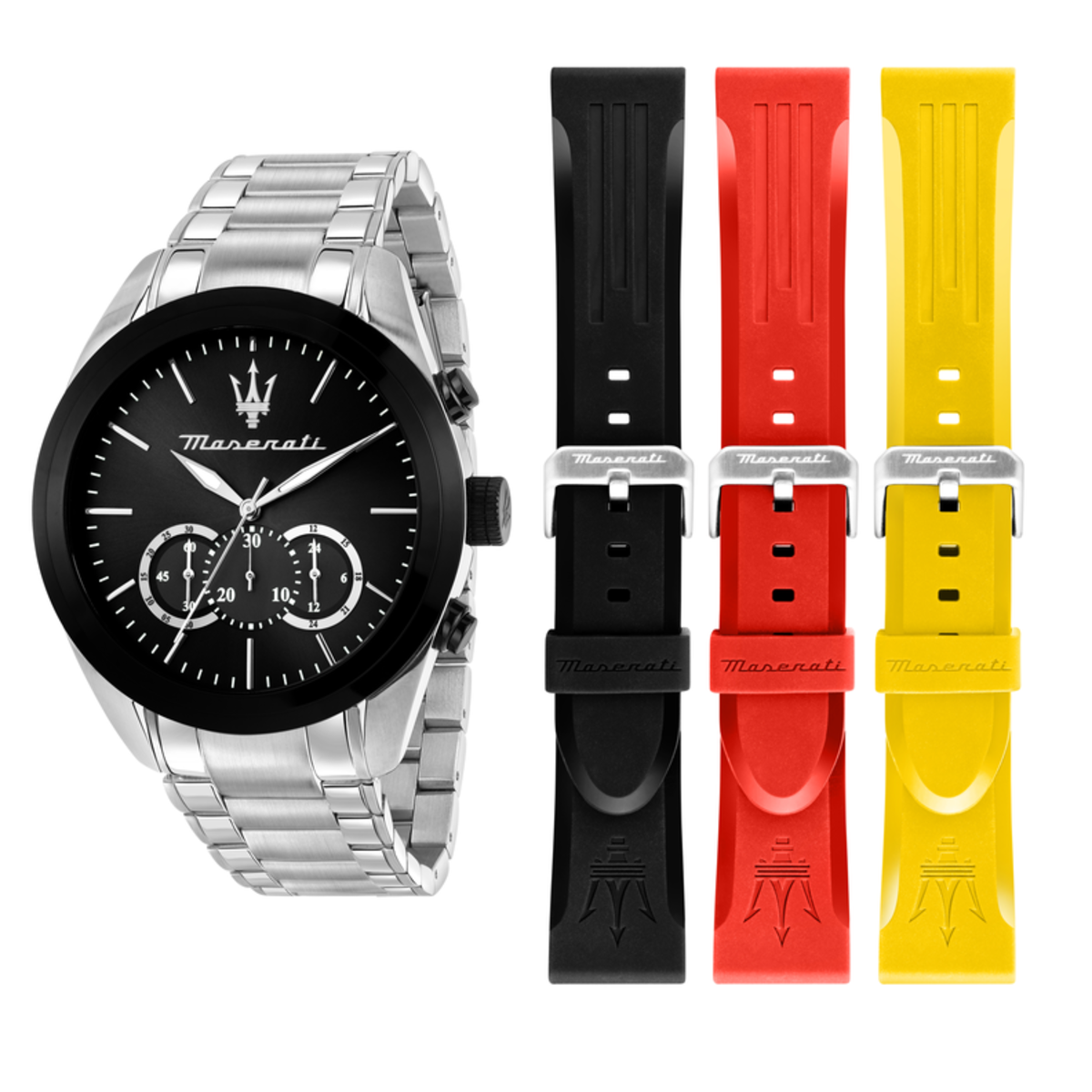 Reloj Maserati Hombre R8873612062 Traguardo Negro Cronógrafo Acero Plateado Analógico. Caja de acero de 45mm de diámetro. Bisel negro. Brazalete de acero plateado. Cierre desplegable. Esfera negra. Multifunción, calendario, cronógrafo. Cristal mineral. Movimiento quartz. Sumergible 100m. Incluye 3 correas de silicón. 3 años de garantía. Ref R8873612062