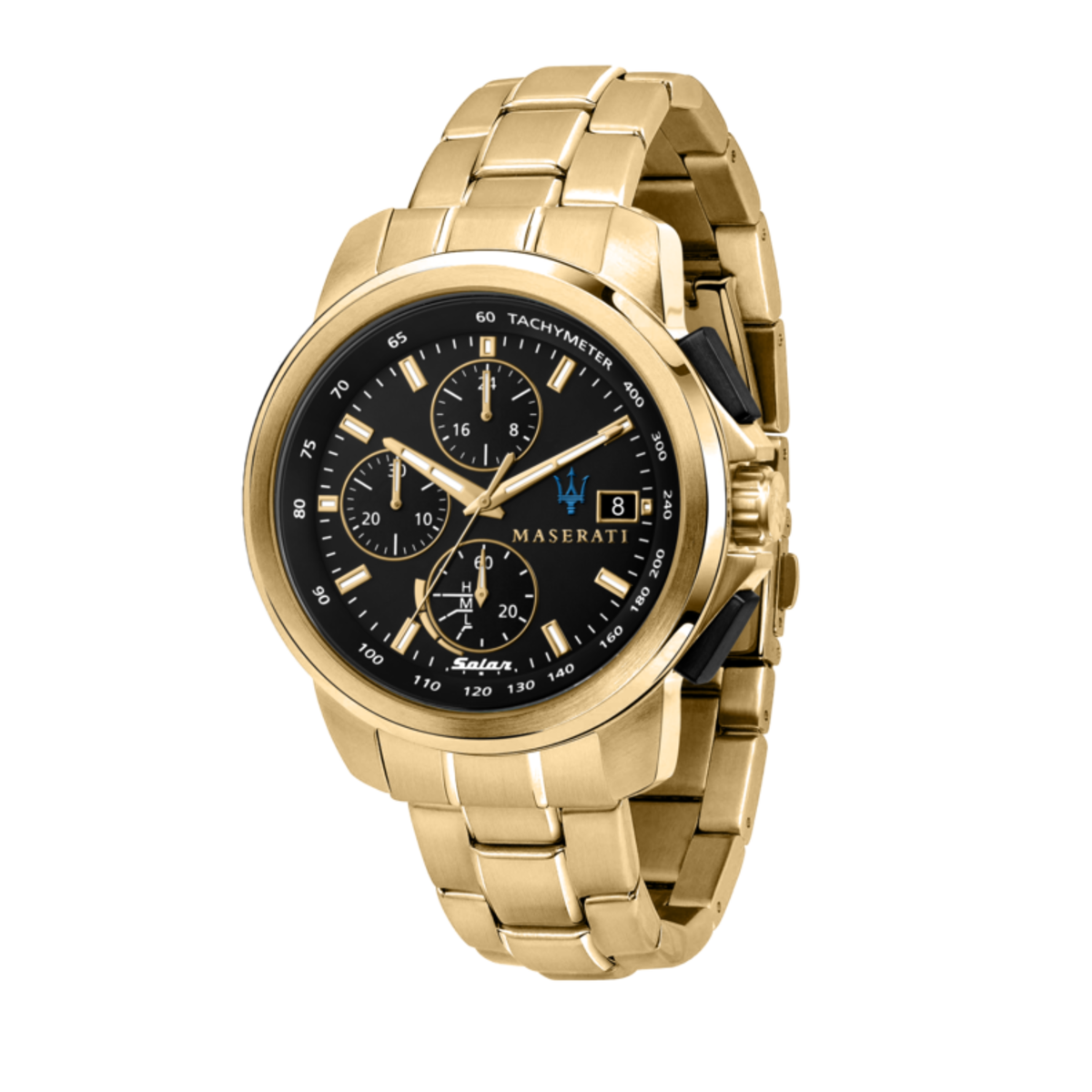 Reloj Maserati Hombre R8873645002 Successo Negro Acero Dorado Solar Analógico. Caja de acero dorado de 44mm de diámetro. Bisel dorado. Brazalete de acero dorado. Cierre mariposa. Esfera negra. Multifunción, calendario. Cristal mineral. Movimiento solar. Sumergible 100m. 3 años de garantía. Ref R8873645002