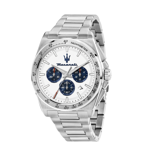 Reloj Maserati Hombre R8873652007 Velocitá Cronógrafo Acero Plateado Analógico. Caja de acero plateado de 43mm de diámetro. Bisel plateado. Brazalete de acero plateado. Cierre desplegable. Esfera blanca. Multifunción, cronógrafo, calendario. Cristal mineral. Movimiento quartz. Sumergible 100m. 3 años de garantía. Ref R8873652007