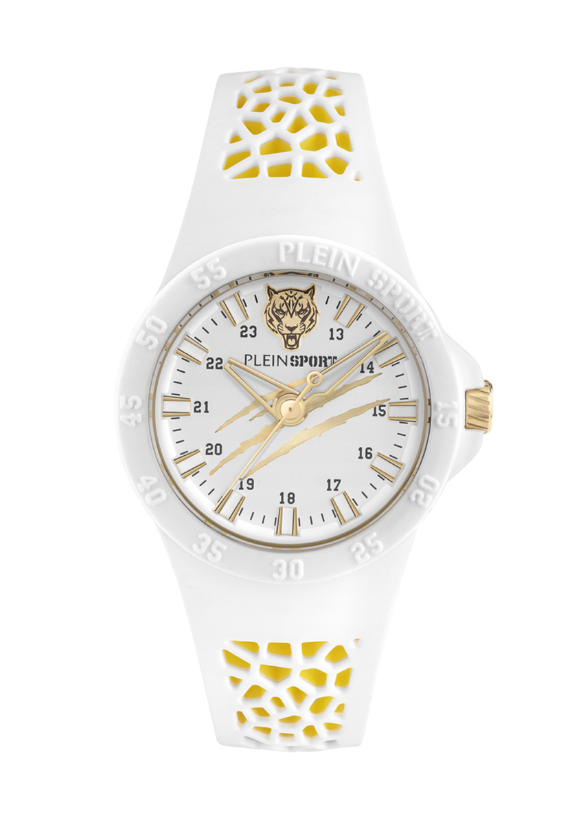 Reloj Philipp Plein Sport Hombre PSBBA0323 Sport Blanco Analógico. Caja de plástico blanco de 40mm de diámetro. Bisel blanco. Correa de silicona blanco bicolor dorado. Cierre hebilla. Esfera blanca. Cristal mineral. Movimiento quartz. Sumergible 50m. 3 años de garantía. Ref PSBBA0323