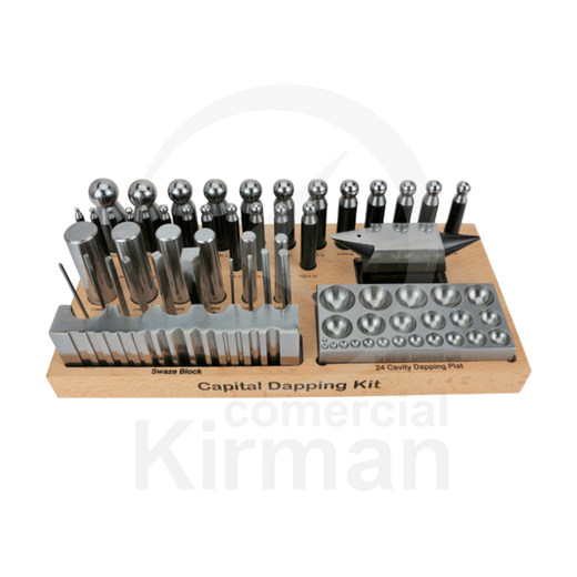 Set Embutidores Capital Dapping Acero 28161 (24) Unidades + (10) Punzones Redondos + (6) Punzones Cuadrados. Set embutidores fabricado en acero. Diseño de (24) unidades + (10) punzones redondos + (6) punzones cuadrados. Incluye: Una base de embutir con 24 semiesferas, una bigornia. Producto de excelente calidad, con garantía contrastada que asegura su fiabilidad y durabilidad. Ref 28161